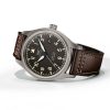 The Pilot’s Watch Mark XVIII Heritage features a design that is reduced to the absolute essentials. Its retro look, inspired by the famous Big Pilot’s Watch 52 T.S.C., gives this navigation watch a particularly striking appearance. With its contrasting dial and displays, it closely reflects the ideal established by classic pilot’s watches. The displays are round, large and clearly arranged. This later developed into the cockpit design: not even a single line is unnecessary – everything is designed to be clear and legible. The dial features large, rounded Arabic numerals to mark the minutes, with two exceptions: the 12 has been replaced with a triangle with dots at either side for improved legibility, while a date window is positioned where the 3 would usually be – adding a modern feature to this vintage-inspired design. This model comes with a stylish brown calfskin strap.