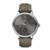 Stainless steel case, Manual-winding, Diameter 45.0 mm, Grey suede strap, Strap width 22.0 mm.