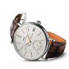 In the Portofino Hand-Wound Eight Days, the IWC-manufactured 59210-calibre movement will run precisely and reliably for a full 192 hours, or 8 days, before it automatically stops. Strictly speaking, it is 9 days, but the extra day in reserve ensures that the movement maintains as constant a driving torque as possible and continues to run precisely. The owner will always be on the safe side if he winds his watch once a week. The power remaining can be read off on the power reserve display on the dial. Together with the small seconds display and date display, this gives the dial a pleasing equilibrium. The indexless balance has a frequency of 28,800 beats per hour and, together with the Breguet spring bent into shape in accordance with age-old watchmaking tradition, helps to make the watch exceptionally accurate. The watch is available with a stainless-steel case, silver-plated dial and solid gold indices. It has a transparent sapphire-glass back and a brown alligator leather strap from the House of Santoni.