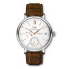 In the Portofino Hand-Wound Eight Days, the IWC-manufactured 59210-calibre movement will run precisely and reliably for a full 192 hours, or 8 days, before it automatically stops. Strictly speaking, it is 9 days, but the extra day in reserve ensures that the movement maintains as constant a driving torque as possible and continues to run precisely. The owner will always be on the safe side if he winds his watch once a week. The power remaining can be read off on the power reserve display on the dial. Together with the small seconds display and date display, this gives the dial a pleasing equilibrium. The indexless balance has a frequency of 28,800 beats per hour and, together with the Breguet spring bent into shape in accordance with age-old watchmaking tradition, helps to make the watch exceptionally accurate. The watch is available with a stainless-steel case, silver-plated dial and solid gold indices. It has a transparent sapphire-glass back and a brown alligator leather strap from the House of Santoni.