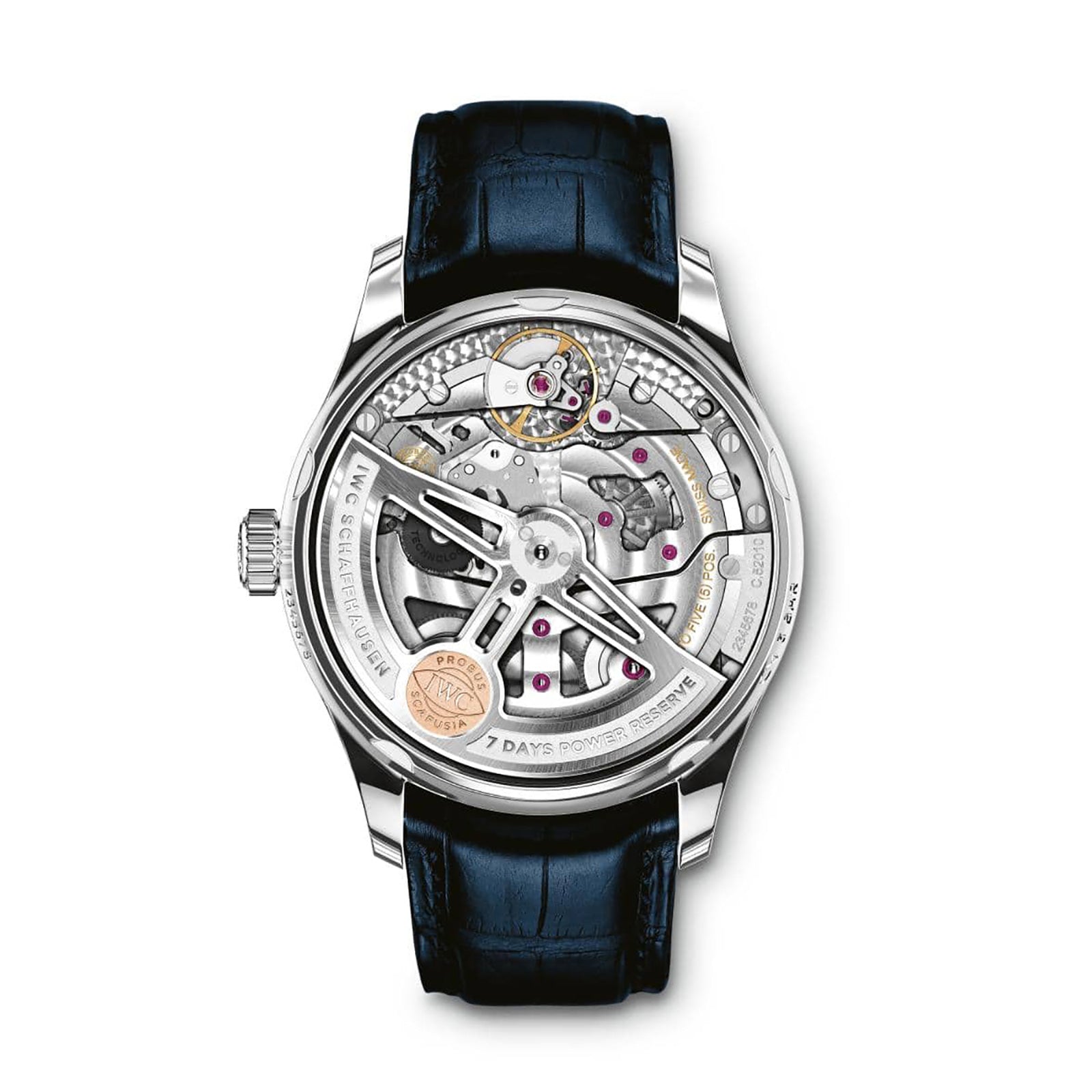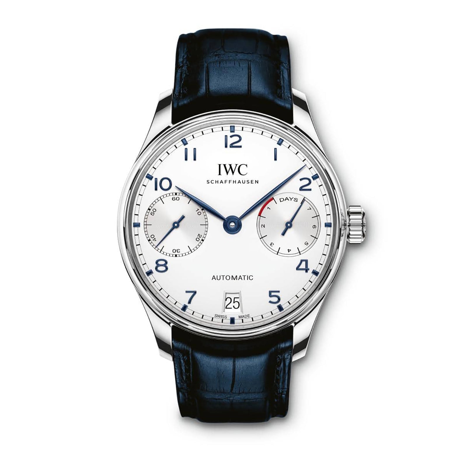 The Portugieser Automatic has become one of the most successful Portugieser models ever to be produced in Schaffhausen. The balanced dial design retains the classic appeal of the legendary original Portugieser first manufactured in the 1930s. The pawls, automatic wheel and rotor bearing in the legendary Pellaton winding system are made from extremely wear-resistant ceramic, while two barrels build up an impressive 7-day power reserve. The ergonomically optimized strap horns ensure greater comfort even on slimmer wrists. The Portugieser Automatic is available with a 42.3-millimetre stainless-steel case, silver-plated dial and blue hands and appliqués. Thanks to the slimmed-down rotor, a glance through the transparent sapphire-glass back reveals even more details of the IWC-manufactured 52010-calibre, such as the black ceramic pawls in the winding system or the Geneva stripe decoration.