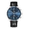The Portugieser Chronograph is one of IWC Schaffhausen’s most iconic models. With its compact diameter of 41 millimetres, it fits almost any wrist. However, the thin bezel gives one the impression of wearing a significantly larger watch. The clear, functional dial boasts applied Arabic numerals and slender Feuille hands. Printed with a quarter-second scale, the characteristic réhaut not only allows precise reading of the stop time but also reminds us of the Portugieser’s origins as a nautical precision instrument for the wrist. This model features a stainless steel case, a blue dial, as well as rhodium-plated hands and appliqués; it is fitted with a black alligator leather strap. Inside the sporty-elegant chronograph, the IWC-manufactured 69355 calibre is at work. The robust and precise chronograph movement in classic column-wheel design is visible through a sapphire-glass case back.