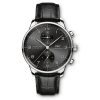 The Portugieser Chronograph is one of IWC Schaffhausen’s most iconic models. With its compact diameter of 41 millimetres, it fits almost any wrist. However, the thin bezel gives one the impression of wearing a significantly larger watch. The clear, functional dial boasts applied Arabic numerals and slender Feuille hands. Printed with a quarter-second scale, the characteristic réhaut not only allows precise reading of the stop time but also reminds us of the Portugieser’s origins as a nautical precision instrument for the wrist. This model features a stainless steel case, a black dial, as well as rhodium-plated hands and appliqués; it is fitted with a black alligator leather strap. Inside the sporty-elegant chronograph, the IWC-manufactured 69355 calibre is at work. The robust and precise chronograph movement in classic column-wheel design is visible through a sapphire-glass case back.