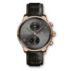 The Portugieser Chronograph is one of IWC Schaffhausen’s most iconic models. With its compact diameter of 41 millimetres, it fits almost any wrist. However, the thin bezel gives one the impression of wearing a significantly larger watch. The clear, functional dial boasts applied Arabic numerals and slender Feuille hands. Printed with a quarter-second scale, the characteristic réhaut not only allows precise reading of the stop time but also reminds us of the Portugieser’s origins as a nautical precision instrument for the wrist. This model features an 18 carat 5N gold case, a slate-coloured dial, as well as golden hands and appliqués; it is fitted with a black alligator leather strap. Inside the sporty-elegant chronograph, the IWC-manufactured 69355 calibre is at work. The robust and precise chronograph movement in classic column-wheel design is visible through a sapphire-glass case back.