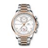 As a nautical sports watch, the Portugieser Yacht Club Chronograph combines timeless elegance with ruggedness and a 6 bar water-resistance. These characteristics make it an extremely versatile timepiece that exudes a beautiful figure both on water and on land. The filigree bezel and flat case ring lend the 44-millimetre stainless-steel case with golden accents expressly elegant proportions. The dial of this sporty chronograph impresses with typical Portugieser design features such as the characteristic minute scale and the appliquéd Arabic numerals. This model combines a silver-plated dial with gold-plated hands and 18-carat gold appliqués. The IWC-manufactured 89361 calibre with flyback function displays the stopped times combined in a single totalizer at “12 o’clock” and features a power reserve of 68 hours. The high-quality bracelet in 18-carat 5N gold and stainless steel ensures a perfect fit on the wrist.