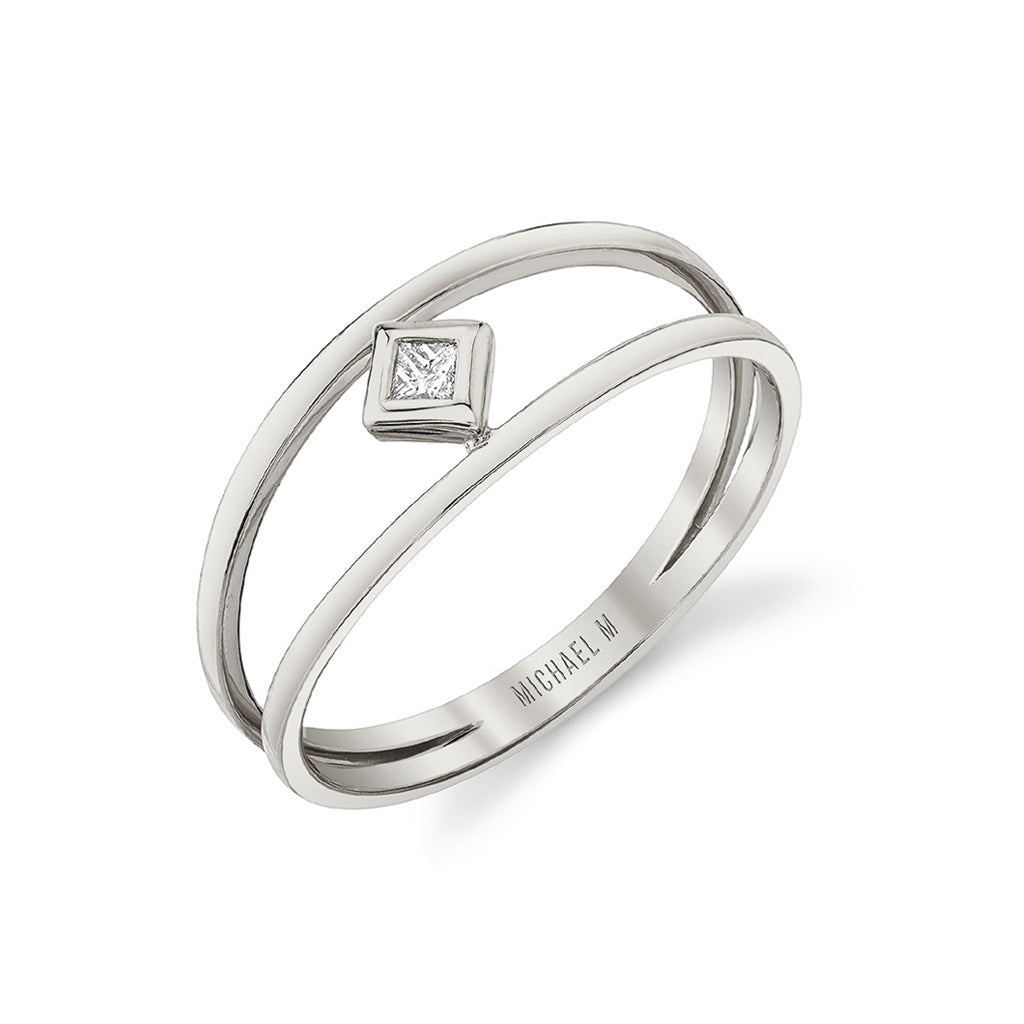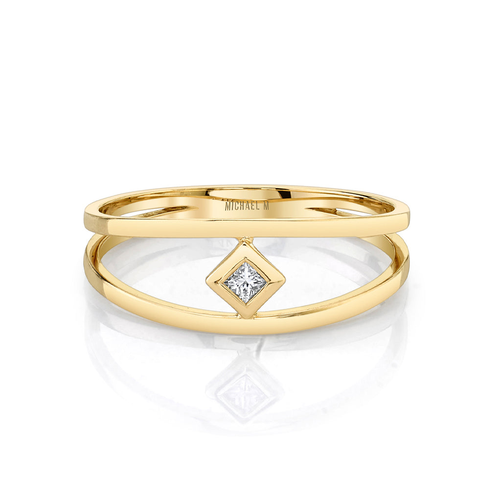 Delicate dimension made to be seen. A classic square bezel with the unique MM twist – a wider frame of gold surrounding the diamond – balanced between two round wire shanks, the Princess Bezel Double Shank Ring is effortless yet distinct.