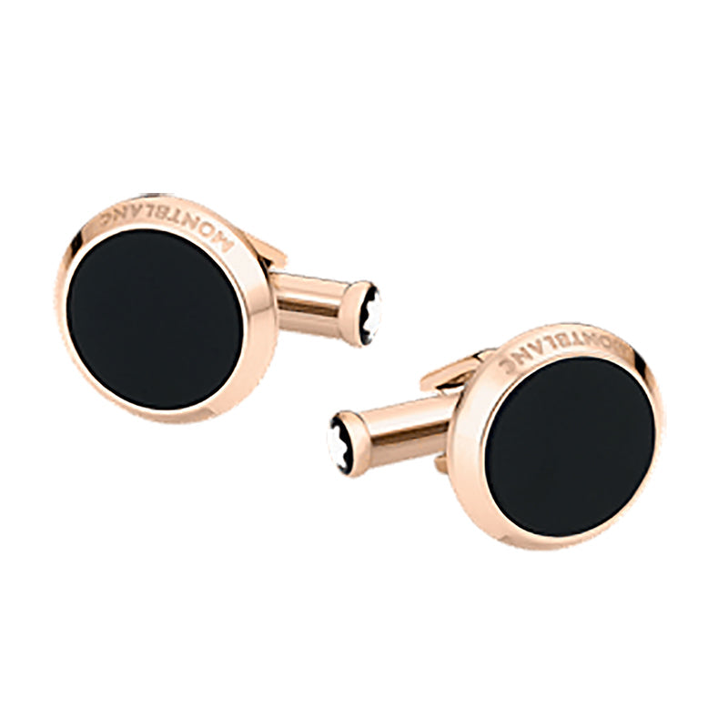 Meisterstück cuff links celebrate timeless style. Linked to the Montblanc Meisterstück writing instrument, the timeless round shape in stainless steel with a red gold-colored PVD finish and onyx inlay creates a jewel with a powerful Montblanc signature.