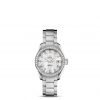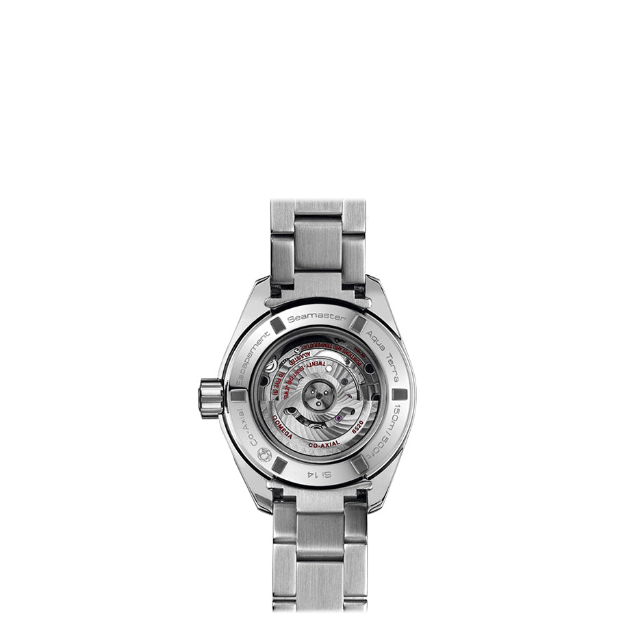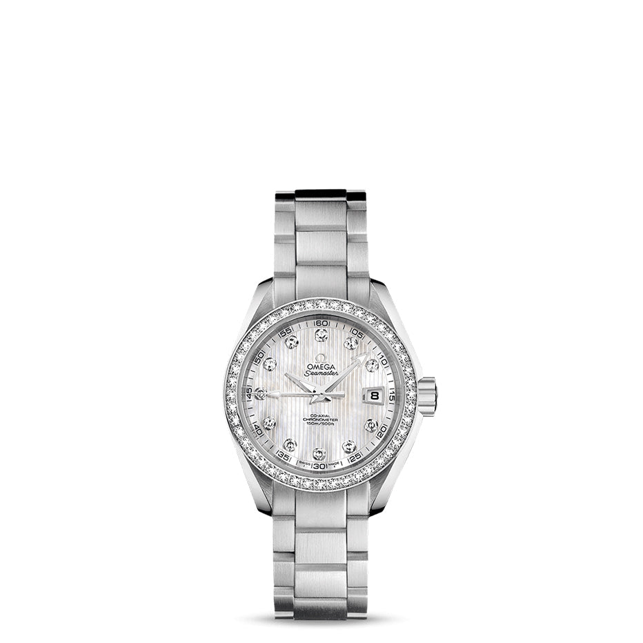 The diamond-set bezel is mounted on a 30 mm stainless steel case on a stainless steel bracelet. This timepiece is powered by the OMEGA Co-Axial calibre 8520 which can be seen through the transparent caseback.