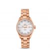 The diamond-set, 18K red gold bezel is mounted on a 30 mm stainless steel casebody on a white leather strap. This timepiece is powered by the OMEGA Co-Axial calibre 8520 which can be seen through the transparent caseback.