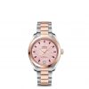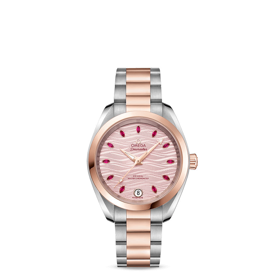OMEGA’s beautiful 34 mm Seamaster has a symmetrical case in stainless steel and 18K Sedna™ gold and a polished bezel. The pale pink wave-embossed dial has central hour/minute and seconds hands in diamond-polished 18K Sedna™ gold, a date window at 6 o’clock and 11 marquise-cut ruby hour markers.