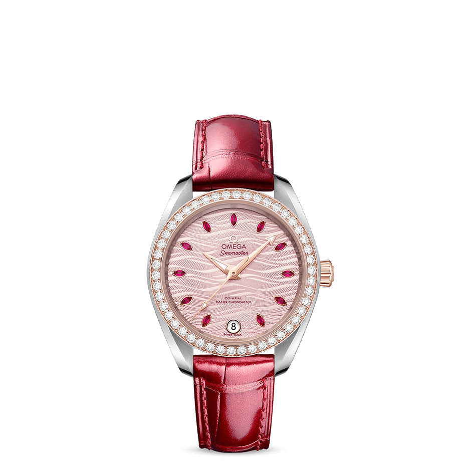 OMEGA’s beautiful 34 mm Seamaster has a symmetrical case in stainless steel and 18K Sedna™ gold and a polished diamond-set bezel. The pale pink wave-embossed dial has central hour/minute and seconds hands in diamond-polished 18K Sedna™ gold, a date window at 6 o’clock and 11 marquise-cut ruby hour markers.