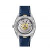 The 41 mm case is stainless steel and houses a silvery opaline dial with horizontal stripes and a date window at 6 o’clock. The hour/minute hands and indexes are blued with white Super-LumiNova, while 18K yellow gold has been used for the OMEGA logo and central seconds hand.