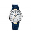 The 41 mm case is stainless steel and houses a silvery opaline dial with horizontal stripes and a date window at 6 o’clock. The hour/minute hands and indexes are blued with white Super-LumiNova, while 18K yellow gold has been used for the OMEGA logo and central seconds hand.