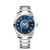 The exterior section of the dial is sun-brushed blue and includes vertical teak stripes and a circle of global destinations printed in red (GMT), silvery (+1h in summer) and blue (places without daylight savings).
