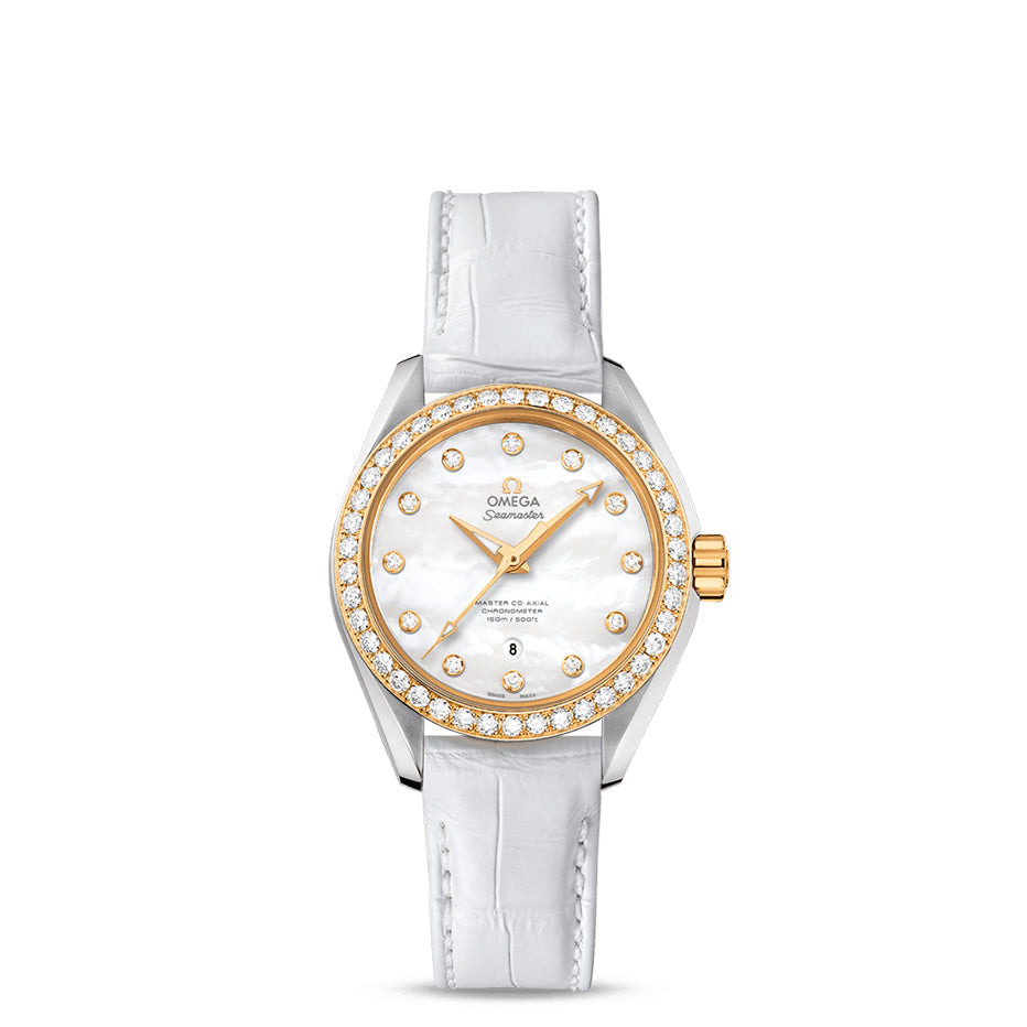 This 34 mm 18K yellow gold and stainless steel ladies’ wristwatch, with its diamond-set bezel, is presented on a white leather strap with a mother-of-pearl effect. At its heart is the revolutionary OMEGA Master Co-Axial calibre 8520, a movement that can resist strong magnetic fields – even those greater than 15,000 gauss.