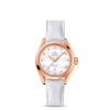 The OMEGA Seamaster Aqua Terra 150M GoodPlanet features a lacquered white dial with applied blue indexes, facetted blued central hour, minute and seconds hands, and a date window at 3 o’clock.