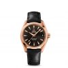 The 18K red gold 41.5 mm case is presented on a brown leather strap. This certified chronometer is powered by the OMEGA Master Co-Axial calibre 8501 which is resistant to magnetic fields greater than 15,000 gauss and can be seen through the transparent caseback.