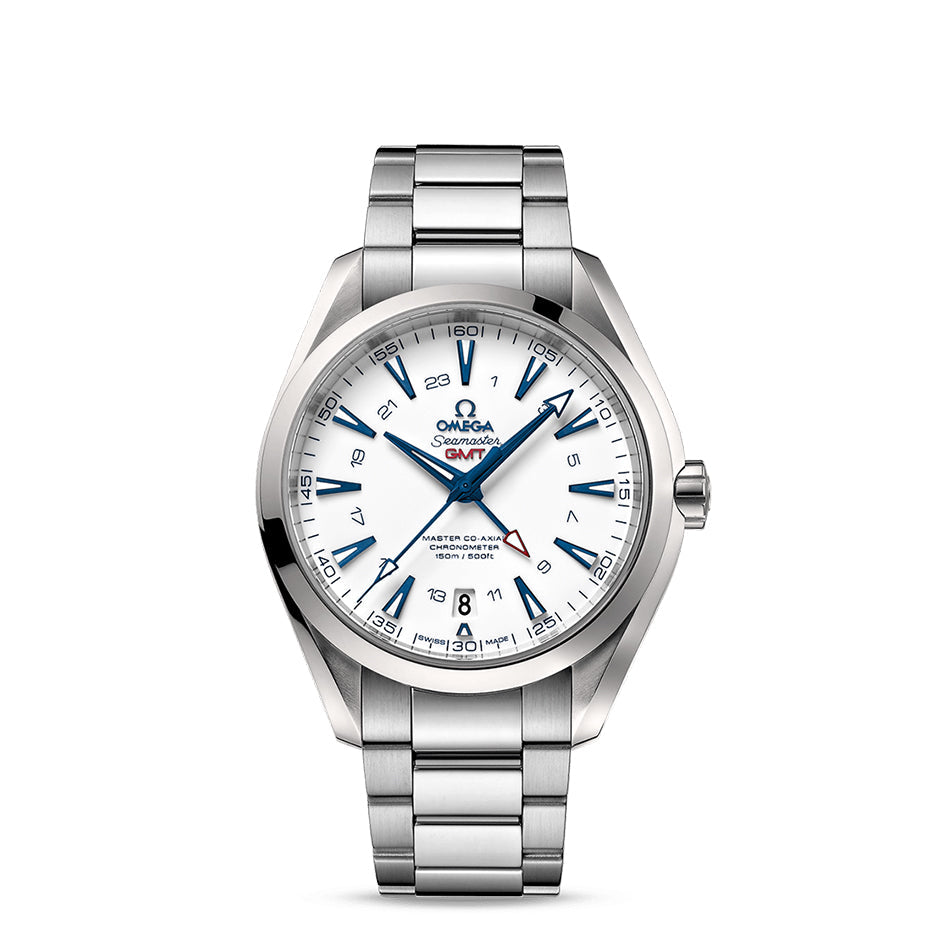 The OMEGA Seamaster Aqua Terra 150M GoodPlanet GMT features a lacquered white dial with applied blue indexes and a 24-hour GMT scale inside the minute track. The central blued GMT hand makes it possible to keep track of the time in two time zones.