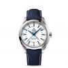 The OMEGA Seamaster Aqua Terra 150M GoodPlanet GMT features a lacquered white dial with applied blue indexes and a 24-hour GMT scale inside the minute track. The central blued GMT hand makes it possible to keep track of the time in two time zones.