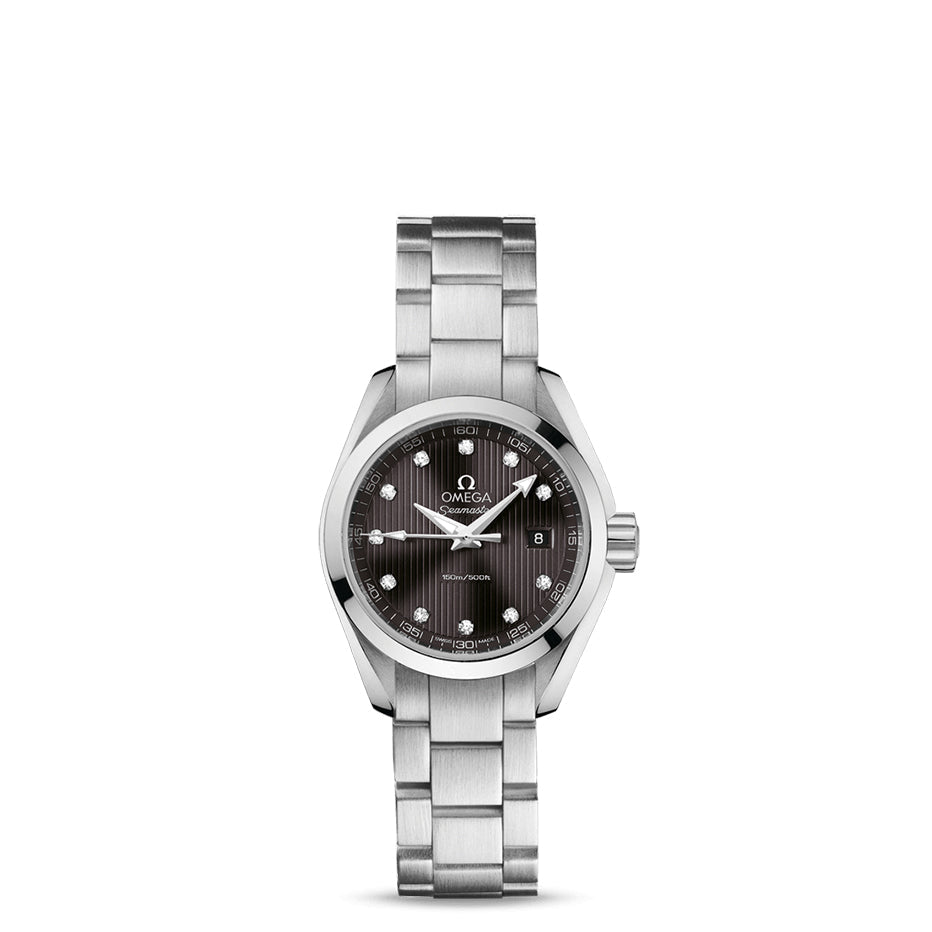 This model features a grey dial decorated with the Teak Concept pattern, diamond-set indexes and a date window at the 3 o’clock position. A scratch-resistant sapphire crystal protects this unique dial. The bezel is mounted on a 30 mm stainless steel case on a stainless steel bracelet. This timepiece is powered by OMEGA’s calibre 4651, a quartz precision movement.