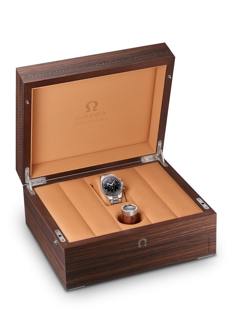 The watch is set on an 18K Canopus Gold™ bracelet with a comfort release adjustment system, and is presented in a special 65th anniversary wooden box made of tulip tree (a Rosewood lookalike) which is inspired by the shape and design of the original Speedmaster boxes.