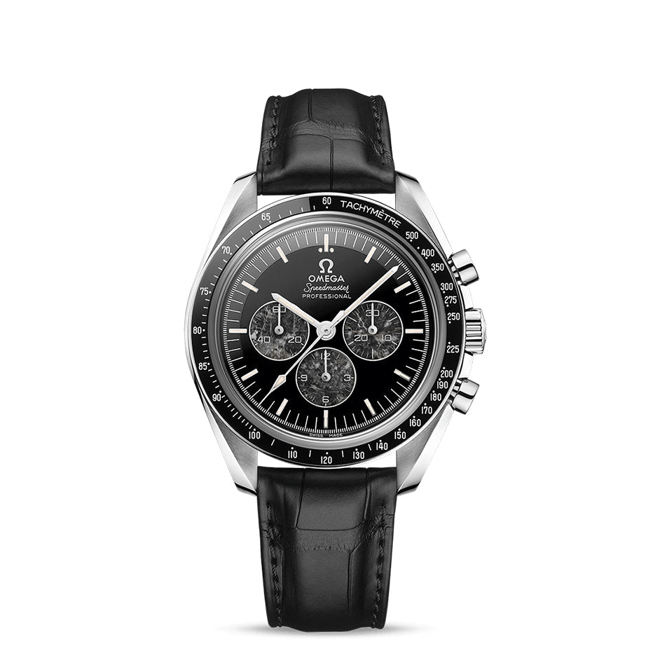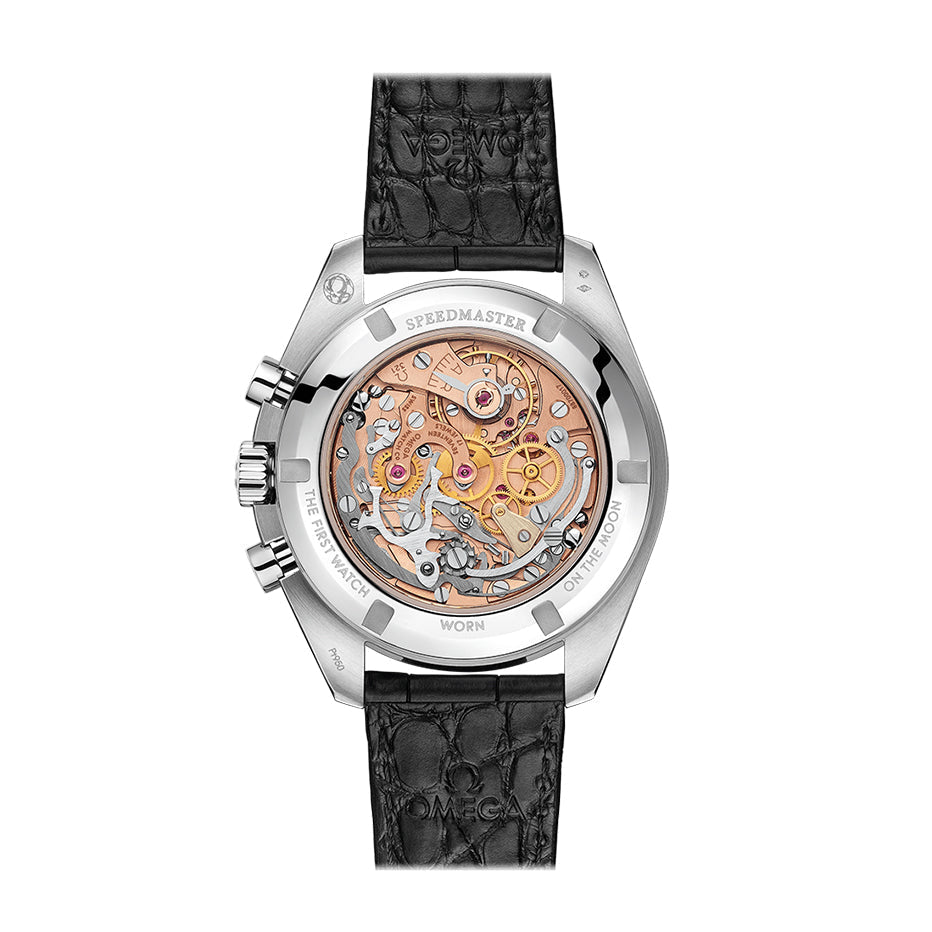 The design also includes a black ceramic bezel with a white enamel tachymeter scale. Most notable is the step dial in black onyx, which uses 18K white gold for the indexes, and most hands. The vintage OMEGA logo is in 18K white gold. The design is completed by three unique subdials formed from a lunar meteorite, the same used for the Speedmaster Apollo 11 50th Anniversary Limited Edition in Moonshine™ Gold.