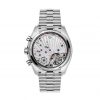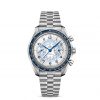 This 43 mm model is crafted in stainless steel with a silvery dial. Along with a blue anodized aluminium bezel ring with its tachymeter scale, the leaf-shaped hands and Arabic numerals are also blued, with a unique “spiral” track pattern running beneath the numbers.