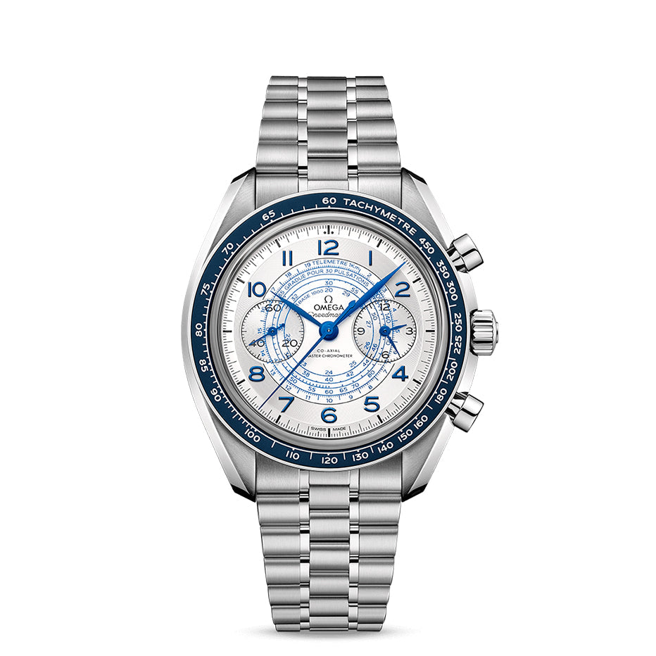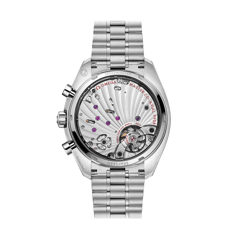 Presented on a stainless steel bracelet, the watch features a small-seconds counter at 9H, and a 60-minute and 12-hour recorder at 3H. Inside, the timepiece is driven by the OMEGA Co-Axial Master Chronometer Calibre 9908.