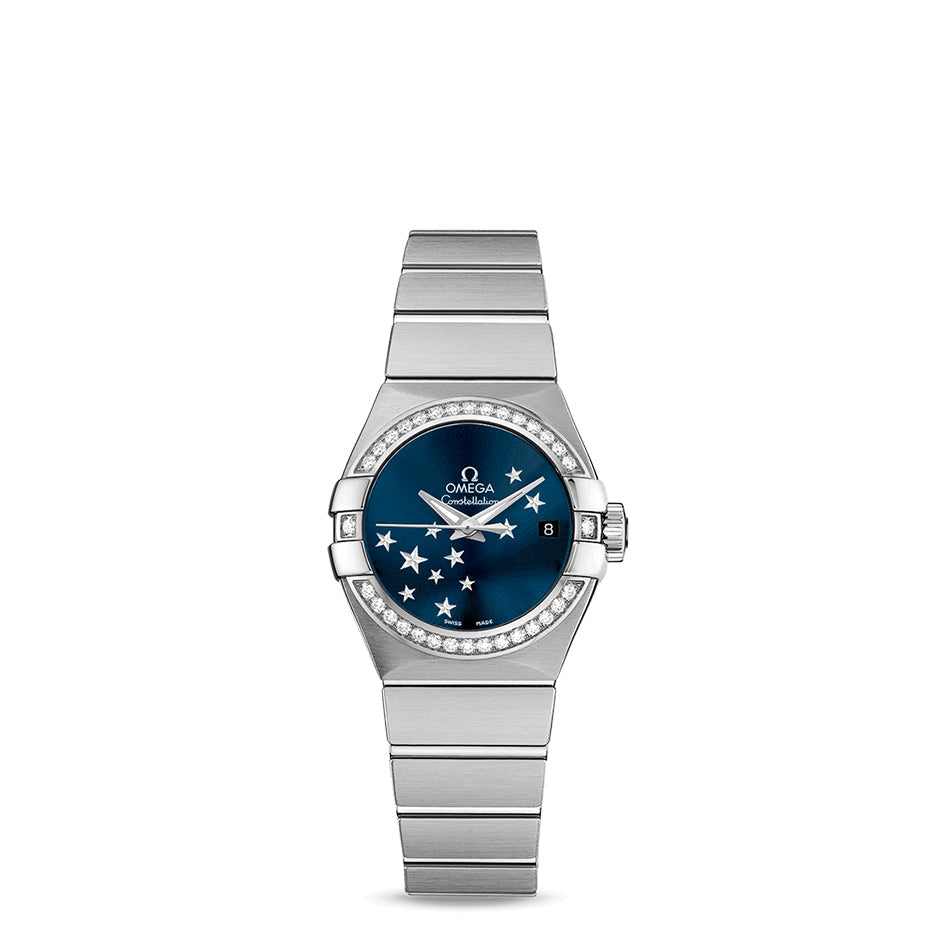 This 27 mm stainless steel wristwatch features applied 18K white gold applied stars on a sun-brushed blue dial that is surrounded by a diamond-paved bezel.