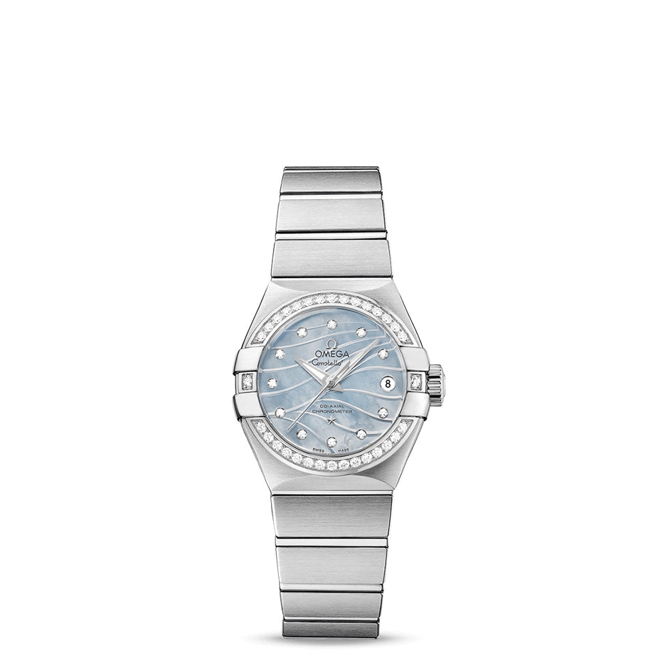 The diamond-set bezel is mounted on a 27 mm stainless steel case and is presented on a stainless steel bracelet. This timepiece is powered by the OMEGA Co-Axial calibre 8520.