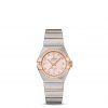 The diamond-set, 18K red gold bezel is mounted on a 27 mm stainless steel casebody and is presented on a stainless steel bracelet with 18K red gold bars. This timepiece is powered by the OMEGA Co-Axial calibre 8520.