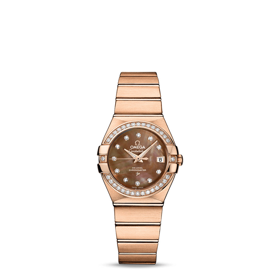 This brushed model features a brown mother-of-pearl dial marked with diamond-set indexes and covered by a scratch-resistant sapphire crystal. The diamond-set bezel is mounted on a 27 mm 18K red gold case, and is presented on an 18K red gold bracelet.