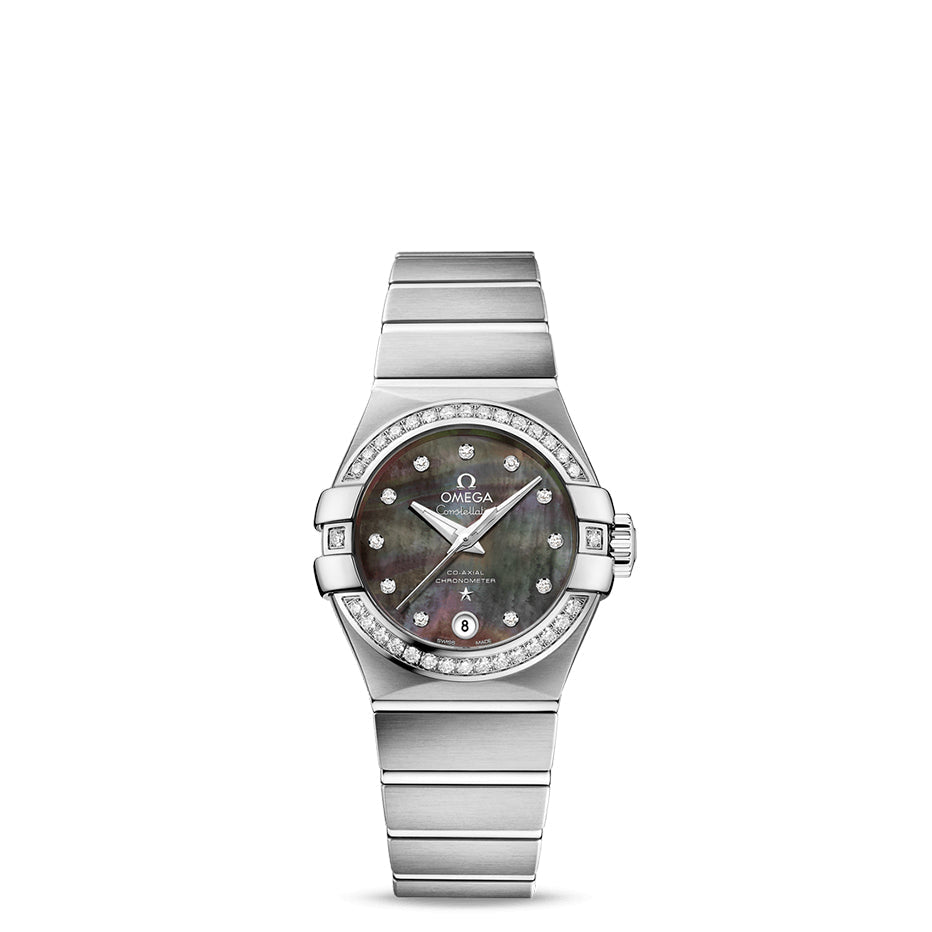 The case and bracelet are made from stainless steel, which includes the iconic “claws” of the Constellation set on a diamond paved bezel.