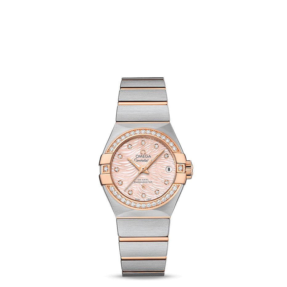 The 18K red gold diamond-set bezel is mounted on a 27 mm stainless steel case and is presented on a stainless steel bracelet with 18K gold links. This timepiece is powered by the OMEGA Co-Axial calibre 8520.