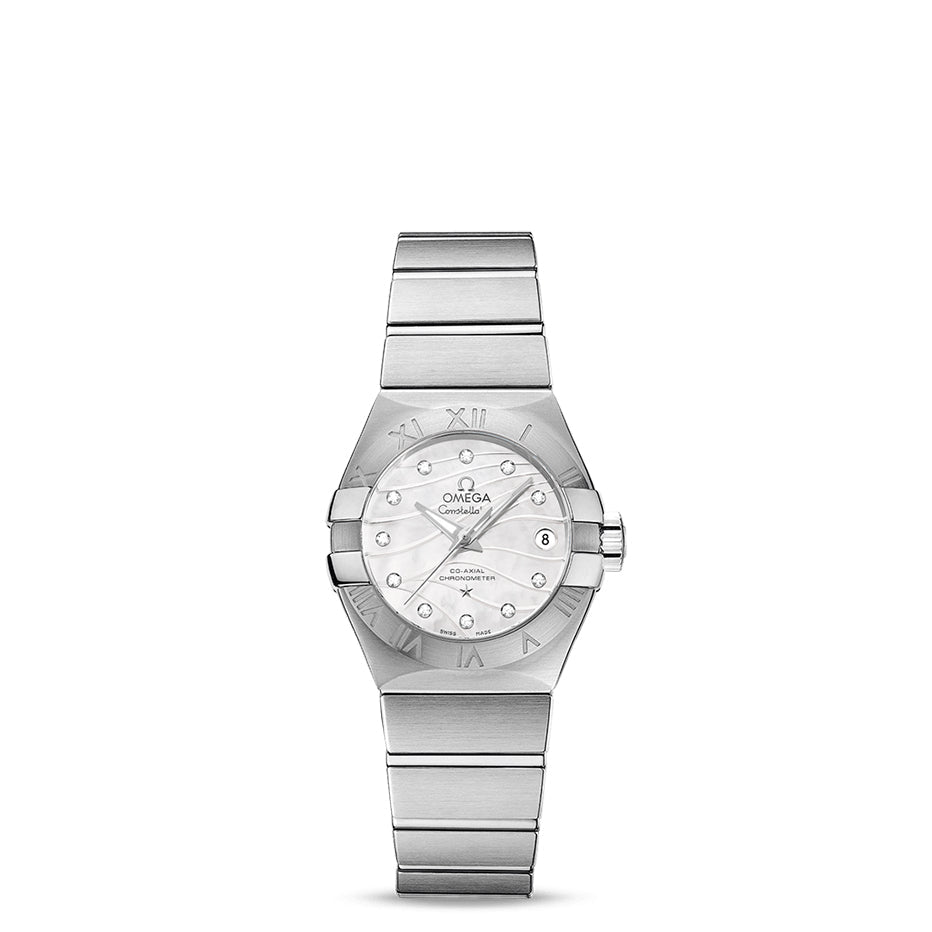 The bezel, with its engraved Roman numerals, is mounted on a 27 mm stainless steel case and is presented on a stainless steel bracelet. This timepiece is powered by the OMEGA Co-Axial calibre 8520.