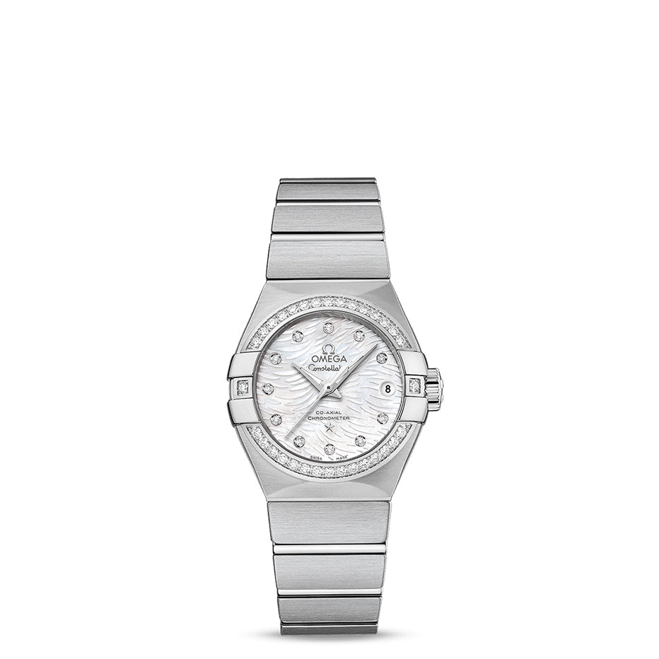 The diamond-set bezel is mounted on a 27 mm stainless steel case and is presented on a stainless steel bracelet. This timepiece is powered by the OMEGA Co-Axial calibre 8520.