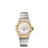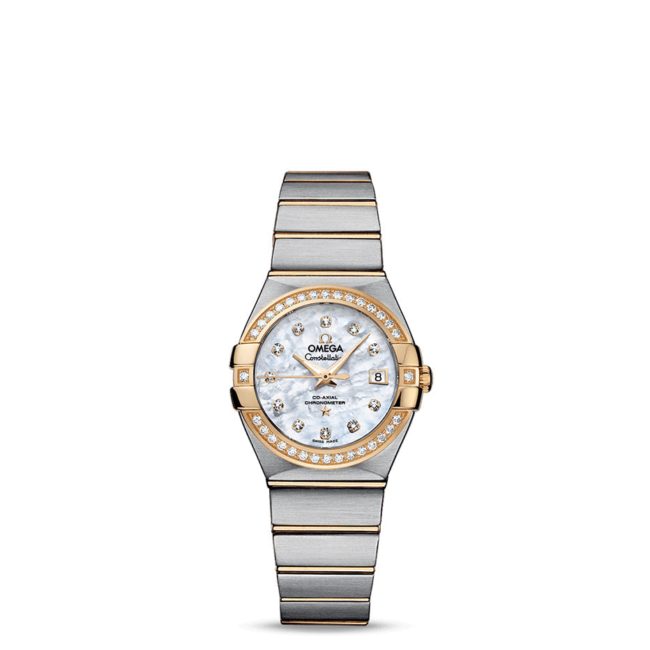 This model features a white mother-of-pearl dial marked with diamond-set indexes and covered by a scratch-resistant sapphire crystal. The diamond-set, 18K yellow gold bezel is mounted on a 27 mm stainless steel casebody, and is presented on a stainless steel and 18K yellow gold bracelet.