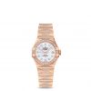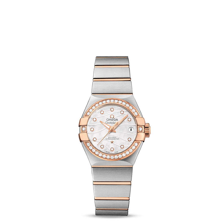 The diamond-set, 18K red gold bezel is mounted on a 27 mm stainless steel casebody and is presented on a stainless steel bracelet with 18K red gold bars. This timepiece is powered by the OMEGA Co-Axial calibre 8520.