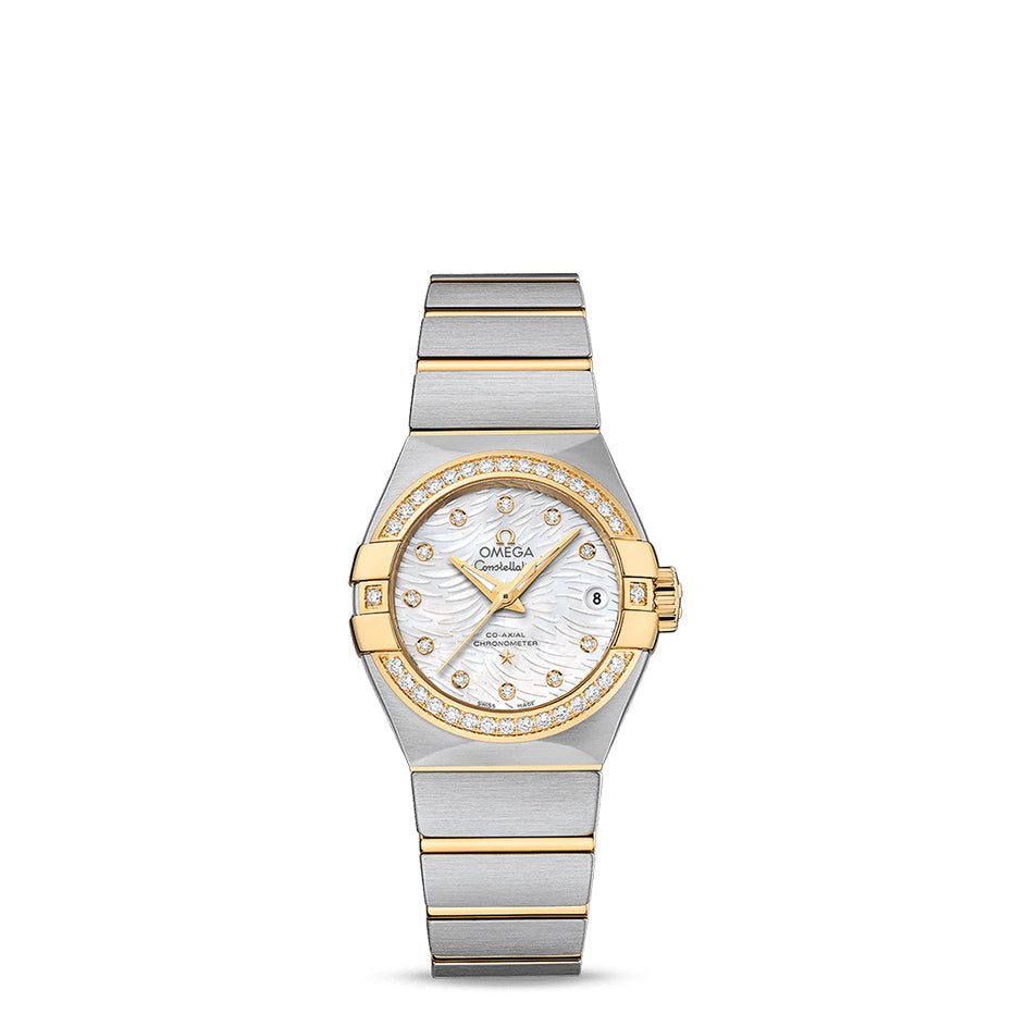 The 18K yellow gold diamond-set bezel is mounted on a 27 mm stainless steel case and is presented on a stainless steel bracelet with 18K gold links. This timepiece is powered by the OMEGA Co-Axial calibre 8520.