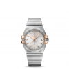 This model features a silver dial decorated with the OMEGA logo in an aligned pattern, diamond-set indexes and a date window at the 3 o’clock position, and covered by a scratch-resistant sapphire crystal. The 18K red gold bezel, with its engraved Roman numerals, is mounted on a 35 mm stainless steel casebody, and is presented on a stainless steel and 18K red gold bracelet.