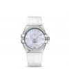 This model features a white mother-of-pearl dial decorated with a supernova pattern, diamond-set indexes and a date window at the 6 o’clock position, and covered by a scratch-resistant sapphire crystal. The diamond-set bezel is mounted on a 35 mm brushed 18K red gold case, and is presented on a white leather strap.