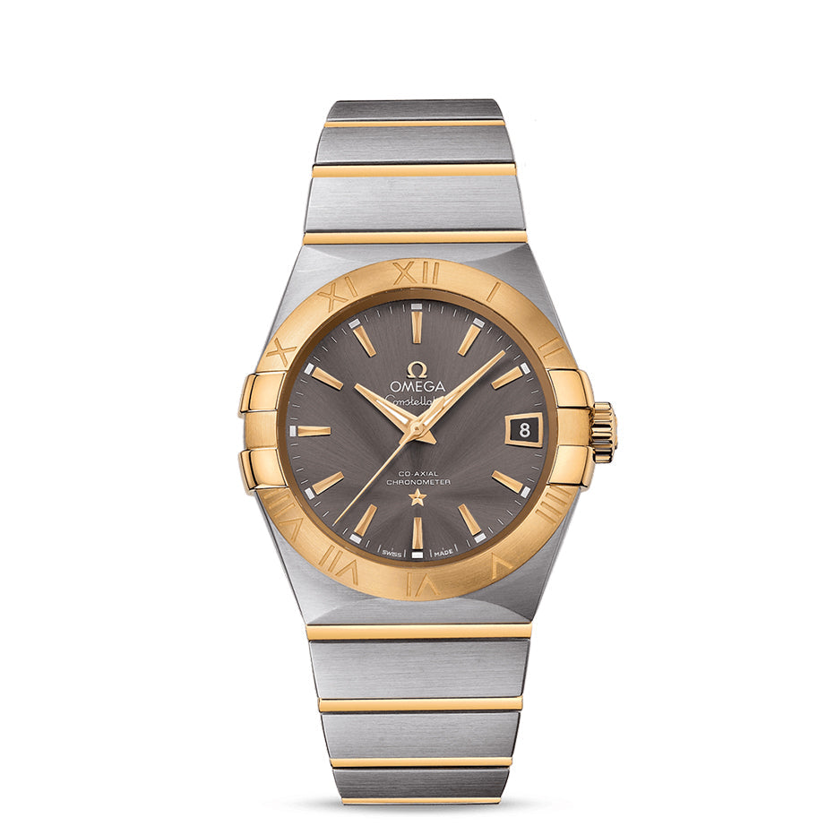 This model features a warm grey dial with a date window at the 3 o’clock position and a scratch-resistant sapphire crystal. The 18K yellow gold bezel, with its engraved Roman numerals, is mounted on a 38 mm stainless steel casebody and is presented on a stainless steel bracelet with 18K yellow gold bars.