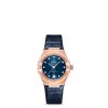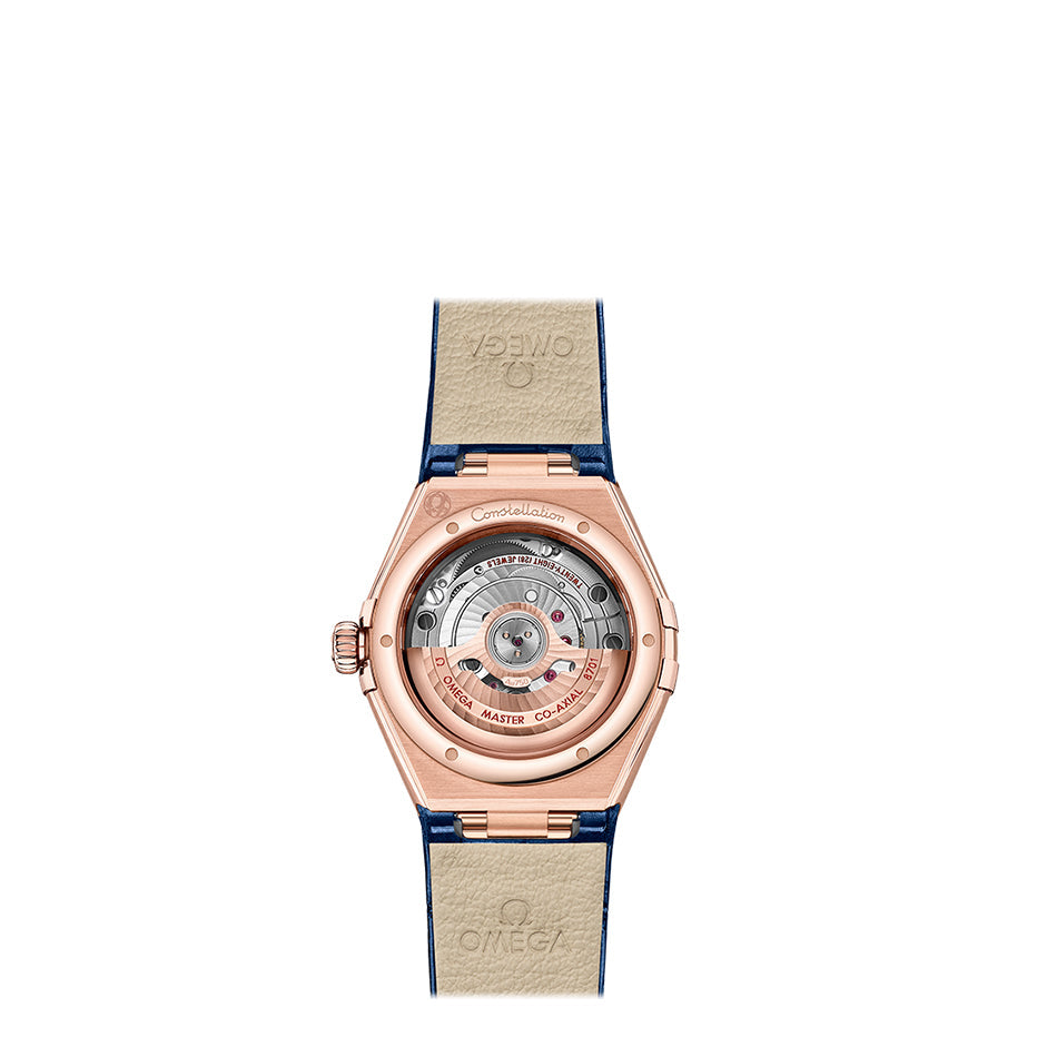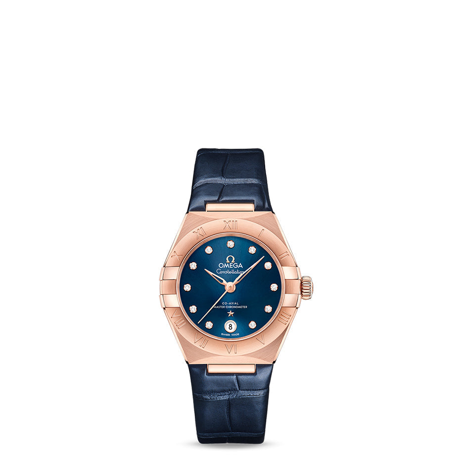 This 29 mm 18K Sedna™ gold model features a bezel with engraved Roman numerals, sun-brushed blue dial with diamond hour markers and a date window at the 6 o’clock position. The hands, OMEGA logo, Constellation star and diamond holders are also in 18K Sedna™ gold.