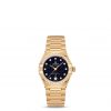 This 29 mm 18K yellow gold model features a diamond-paved bezel, blue aventurine glass dial with diamond hour markers and a date window at the 6 o’clock position. The bracelet, hands, OMEGA logo, Constellation star and diamond holders are also in 18K yellow gold.