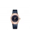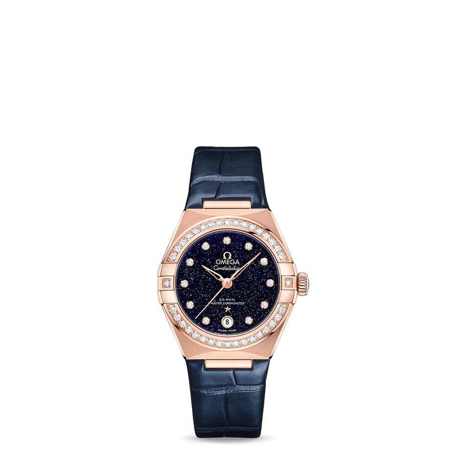 This 29 mm 18K Sedna™ gold model features a diamond-paved bezel, blue aventurine glass dial with diamond hour markers and a date window at the 6 o’clock position. The hands, OMEGA logo, Constellation star and diamond holders are also in 18K Sedna™ gold.