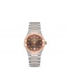 This 29 mm 18K Sedna™ gold and stainless steel model features a bezel engraved with Roman numerals, sun-brushed brown dial with diamond hour markers and a date window at the 6 o’clock position. The hands, OMEGA logo, Constellation star and diamond holders are also in 18K Sedna™ gold.