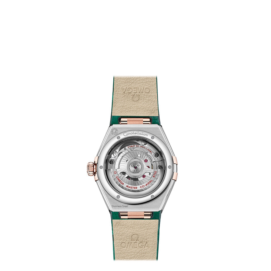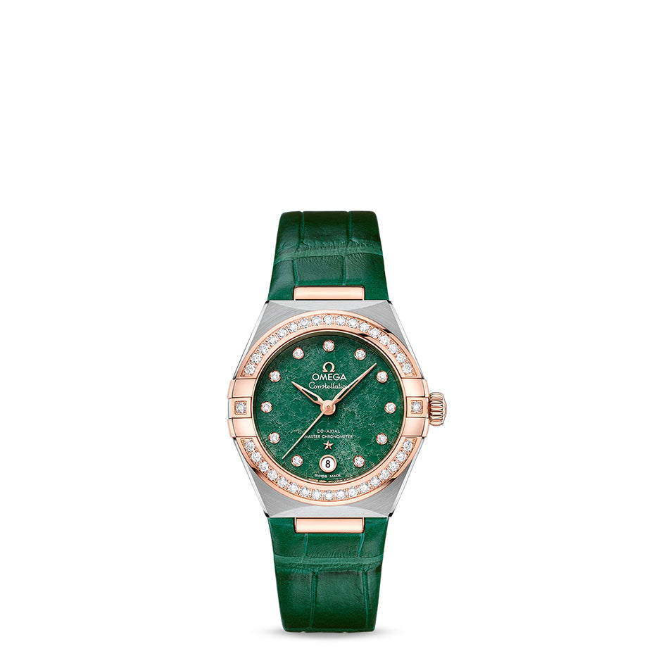Crafted in stainless steel and 18K Sedna™ gold, it has a diamond-paved bezel and a date window at 6 o’clock. The hands, hour markers, OMEGA logo and Constellation star are in 18K Sedna™ gold.