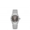 This 29 mm stainless steel model features a bezel engraved with Roman numerals, sun-brushed grey dial with diamond hour markers and a date window at the 6 o’clock position. The hands, OMEGA logo, Constellation star and diamond holders are in 18K white gold.