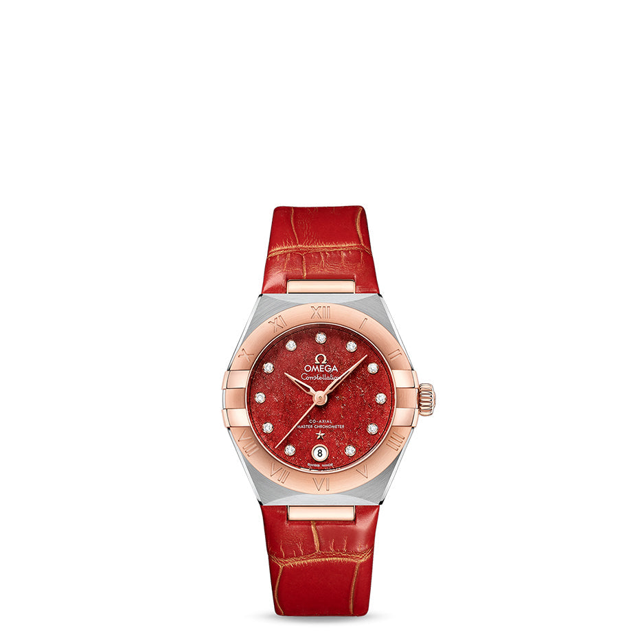 Crafted in stainless steel and 18K Sedna™ gold, it has a bezel engraved with Roman numerals and a date window at 6 o’clock. The hands, hour markers, OMEGA logo and Constellation star are in 18K Sedna™ gold.