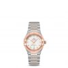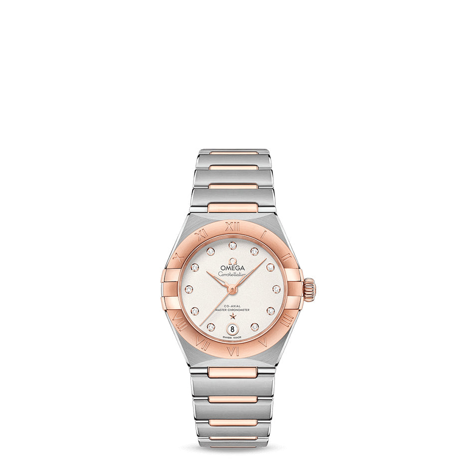 This 29 mm 18K Sedna™ gold and stainless steel model features a bezel engraved with Roman numerals, crystal white silvery dial with diamond hour markers and a date window at the 6 o’clock position. The hands, OMEGA logo, Constellation star and diamond holders are also in 18K Sedna™ gold.